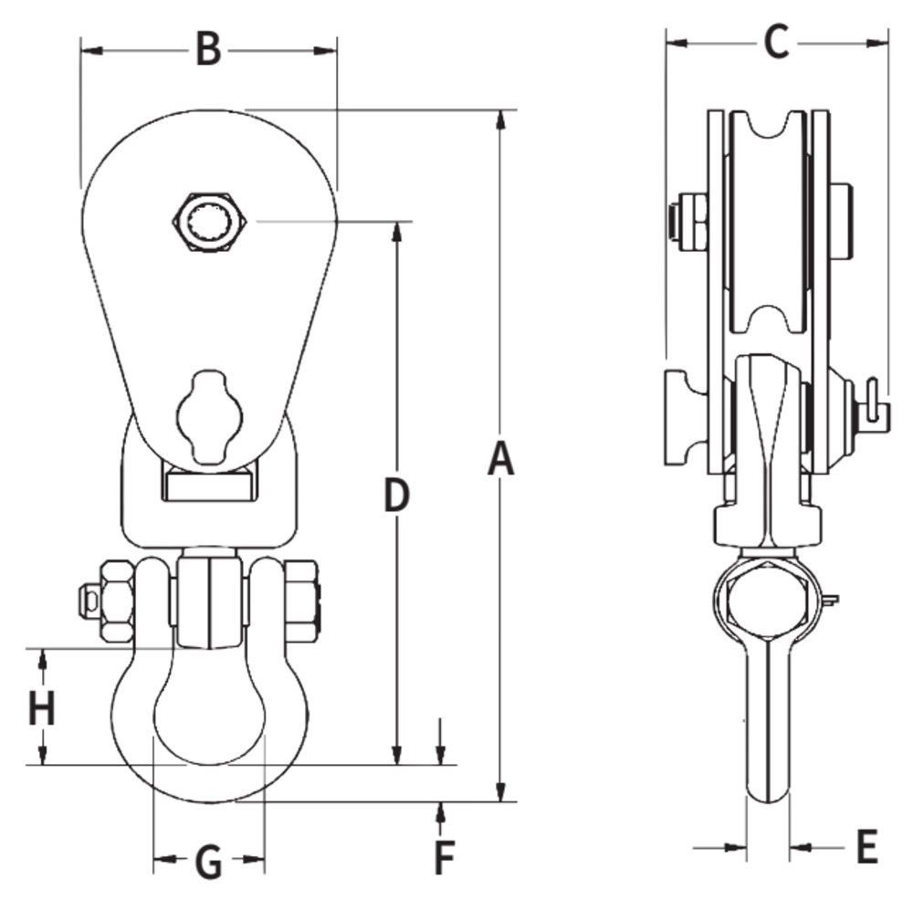 | עומס עבודה בטוח (טון) | קוטר כבל פלדה (מ"מ) | קוטר גלגלת (מ"מ) | משקל יחידה (ק"ג) | מק״ט יצרן | A | B | C | D | E | F | G | H | |